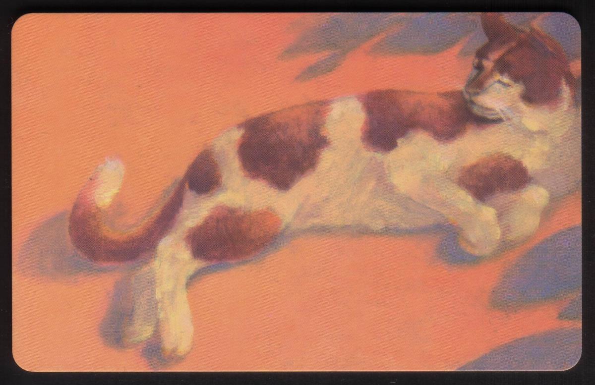 This collectible Hallmark greeting card features an artistic illustration of a lounging cat. The cat is depicted in a relaxed pose, with soft shading and stylized lines emphasizing its fur and posture. The illustration uses warm, muted colors, creating a cozy and inviting atmosphere that highlights the calm and affectionate nature of the cat.