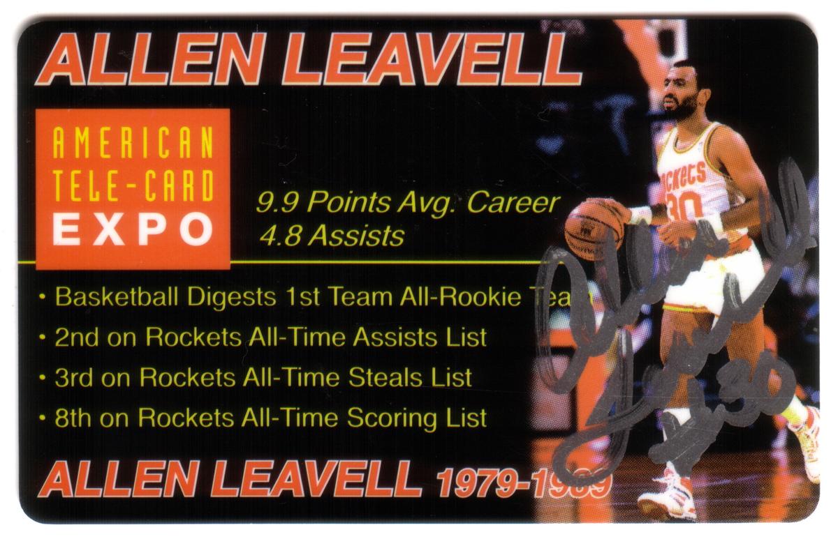 This collectible phone card features an image of Allen Leavell, a former professional basketball player, prominently known for his time with the Houston Rockets. The card includes Allen Leavell’s autograph, making it a signed memorabilia item. The photograph was taken by Bill Baptist and depicts Leavell in his basketball uniform. The card is associated with the Amer Telecard Expo and serves as a fundraiser item supporting the Be An Angel Fund, which aids handicapped and profoundly deaf children.
