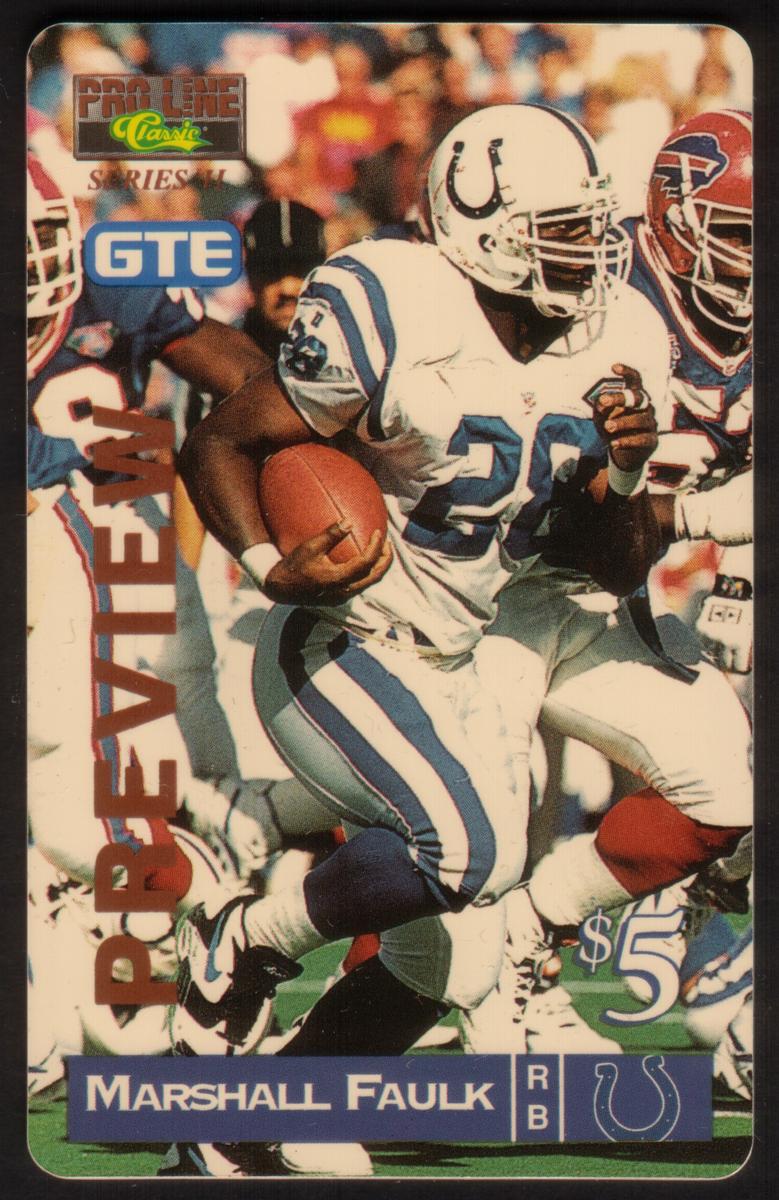 The top left corner of the card displays the NFL logo, emphasizing the official licensing and association with the National Football League. Adjacent to the player image, the card includes the text "Marshall Faulk" clearly identifying the athlete featured. The bottom right corner contains the logo for The Score Board (GTE), a company known for producing sports collectibles and memorabilia.