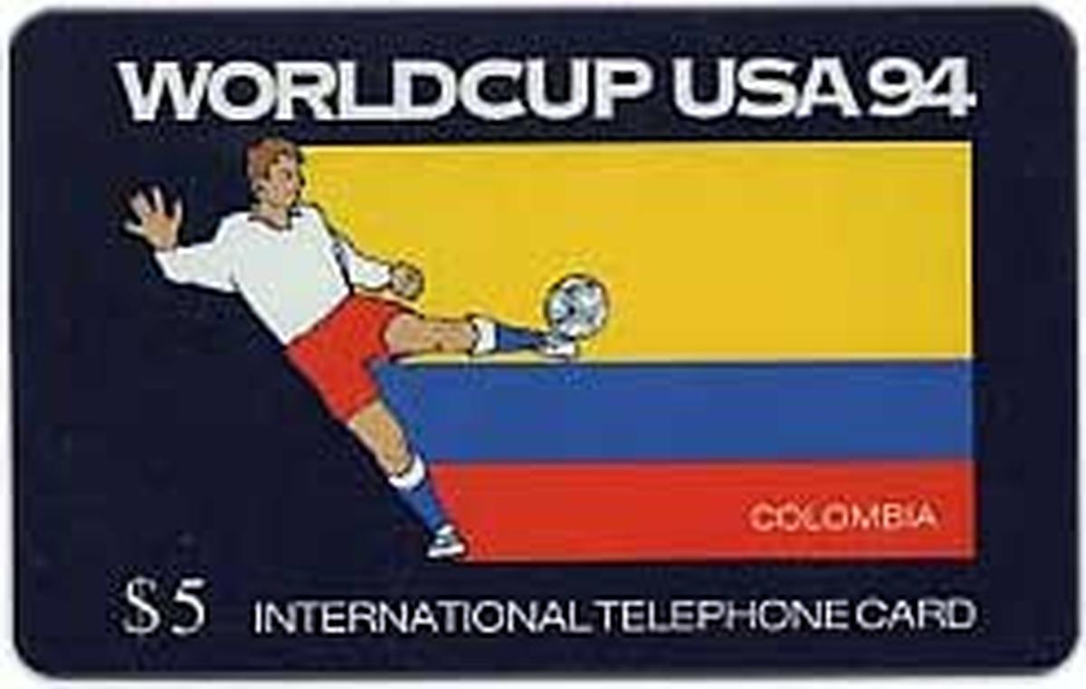 This collectible phone card features an image related to international soccer, specifically highlighting the 1994 FIFA World Cup held in the United States. The design prominently includes the Colombian national flag alongside an athlete in action, controlling a soccer ball. The athlete is depicted wearing a white uniform with red and blue accents, consistent with Colombia’s national colors. The background is a gradient design with subtle incorporation of soccer elements, including faint imagery of soccer balls.