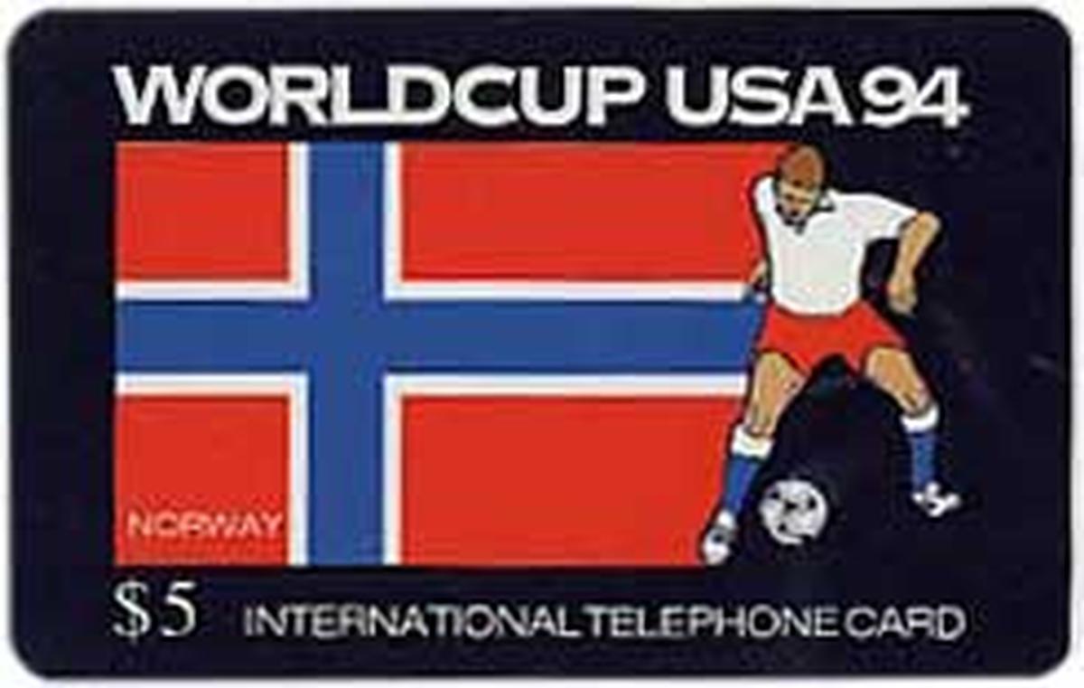 This collectible phone card features a dynamic soccer-themed design highlighting the Norway flag alongside an athlete in motion controlling a soccer ball. The athlete is depicted in action, capturing a moment of play associated with the sport of soccer (also referred to as futbol and fotboll). The overall imagery ties to the 1994 FIFA World Cup held in the USA, as indicated by references to World Cup USA 94 Soccer.
