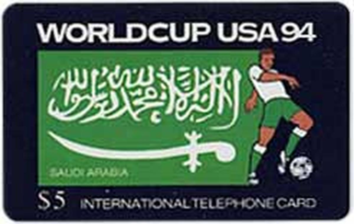 The entire layout visually celebrates the Saudi Arabian national soccer team’s participation in the 1994 World Cup, capturing the sport’s international theme with a focus on soccer elements and country representation. The sports theme is further emphasized by the use of soccer imagery and international flags.