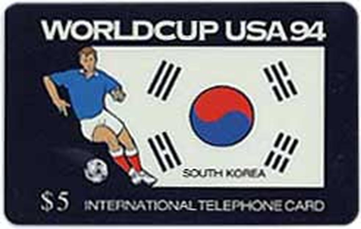 The card belongs to the Global Telecom Network series and uses the "Telephone Charge Unit" system, as indicated by the smaller text near the lower right area of the card. This collectible phone card reflects both the significance of the World Cup and international soccer culture, specifically highlighting South Korea’s participation in the 1994 tournament.