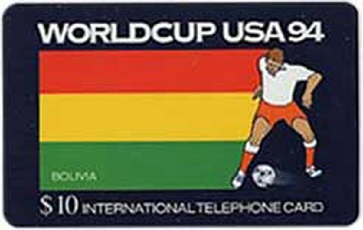 This collectible phone card features a vibrant design centered around the 1994 FIFA World Cup held in the United States. The card prominently displays the national flag of Bolivia on the left side, rendered with precise colors and clear detail. Adjacent to the flag is an athlete in mid-action, controlling a soccer ball, signifying the sport’s dynamic nature. The figure wears a red uniform with white accents, emphasizing the Bolivian team’s colors during international soccer events.