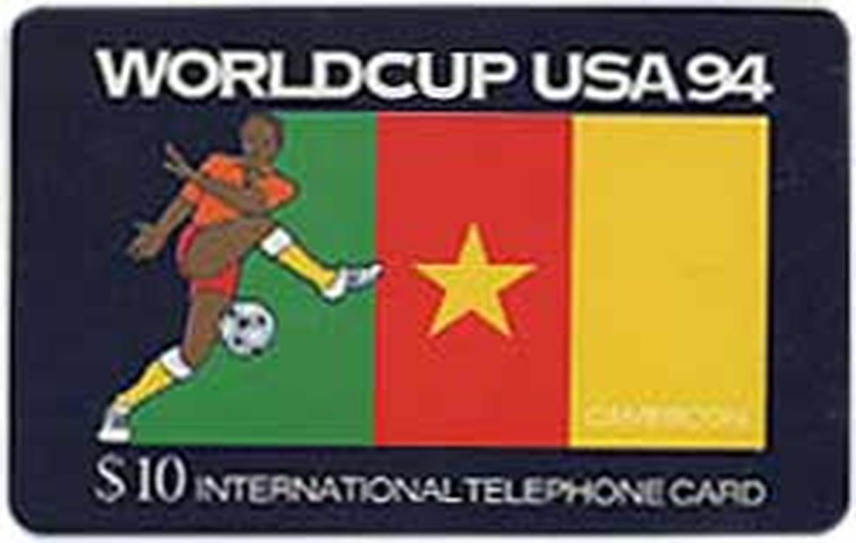 The center of interest remains on the sporting figure and the Cameroon flag, with clean graphic presentation emphasizing the World Cup’s international nature. This card reflects the 1994 FIFA World Cup event focusing on Cameroon’s participation and the global unity brought by the tournament.