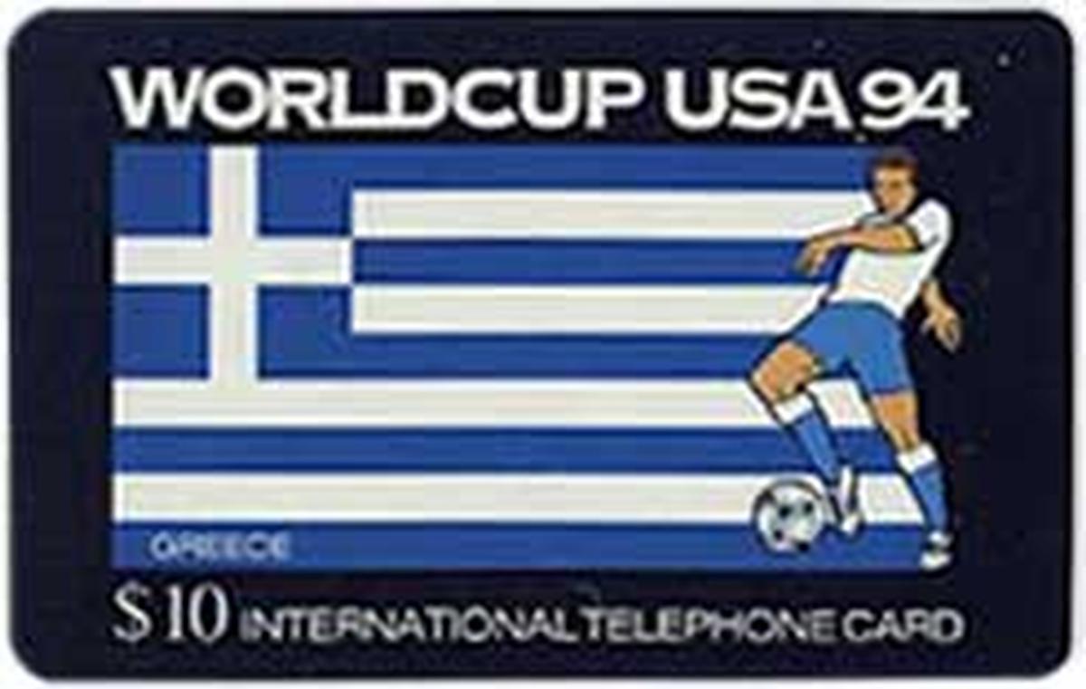 Overall, this phone card celebrates the World Cup and the sport of soccer, with specific focus on Greece’s participation and the broader international environment reflected by the diverse flags. Its design highlights both sport and nationality through clear, vibrant visuals, making it a distinctive collectible for soccer fans and World Cup enthusiasts.