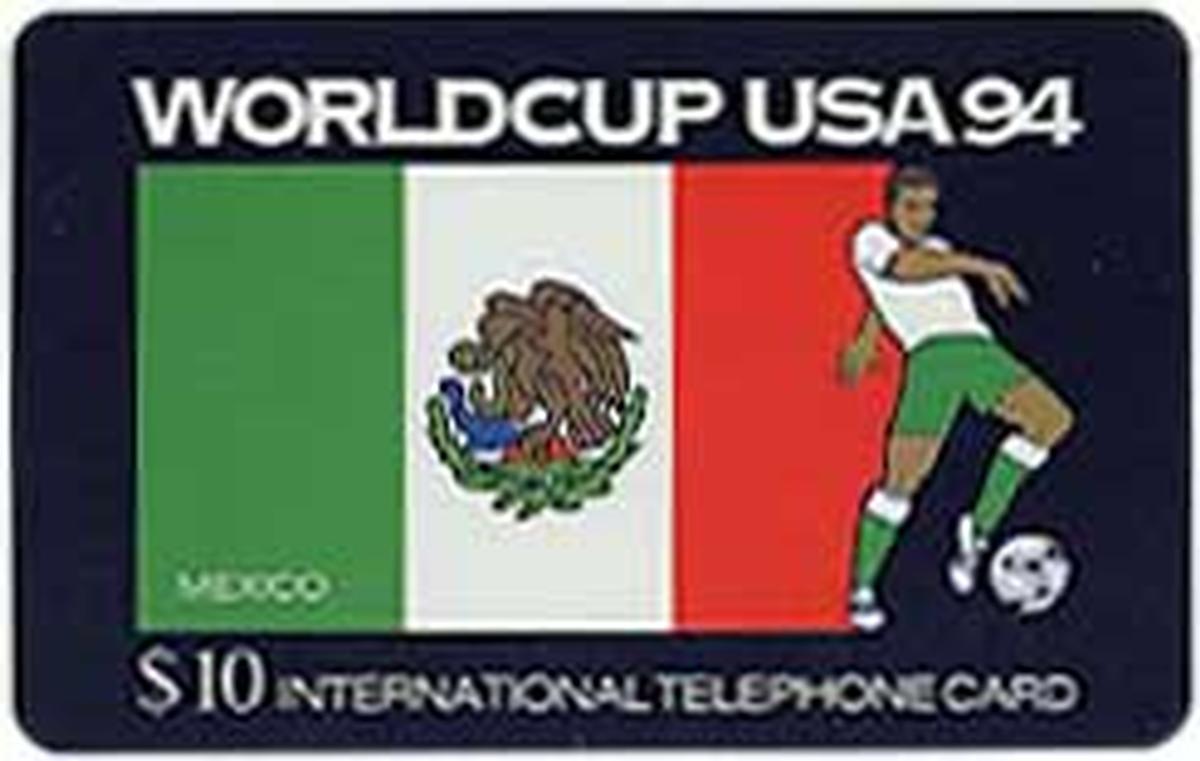 This collectible phone card features a vibrant design related to the 1994 FIFA World Cup held in the United States. The main visual elements include the flag of Mexico positioned prominently on the left side, rendered with bright green, white, and red vertical stripes and the national coat of arms visible in the center stripe. To the right, a Mexican soccer player is depicted in mid-action, controlling a soccer ball with his foot. The athlete wears a white jersey with red and green accents and white shorts, embodying the national team’s colors.