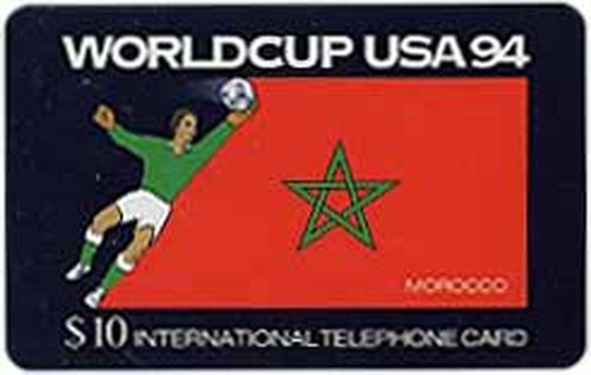 The card carries the branding “German reverse $10,” indicating its monetary or collectible denomination. The presence of “Global Telecom Network” connects it to telecom services related to the card. There are no names of individual players or teams beyond the Moroccan flag and soccer imagery. The design focuses on celebrating the international spirit of the 1994 FIFA World Cup with specific emphasis on Morocco’s participation.