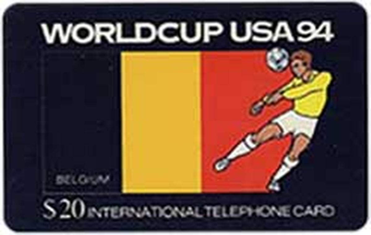 This collectible highlights soccer’s global appeal during the World Cup event, showcasing key visual elements such as the Belgium flag, soccer balls, and an athlete mid-play. The card is a piece of memorabilia connected to international soccer and telecommunications from that time.