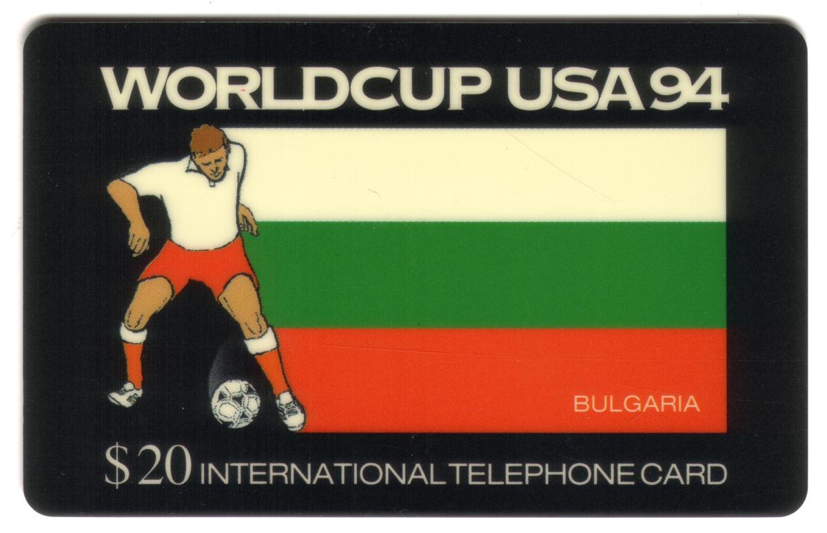 Text on the card references “German reverse $20,” suggesting a value or denomination related to the collectible, but the main focus remains on the soccer theme. The entire design uses vibrant colors to celebrate the international nature of soccer, with the Bulgarian flag as a key national symbol featured prominently. The card is a collectible item connected to soccer’s worldwide appeal and the 1994 FIFA World Cup event.