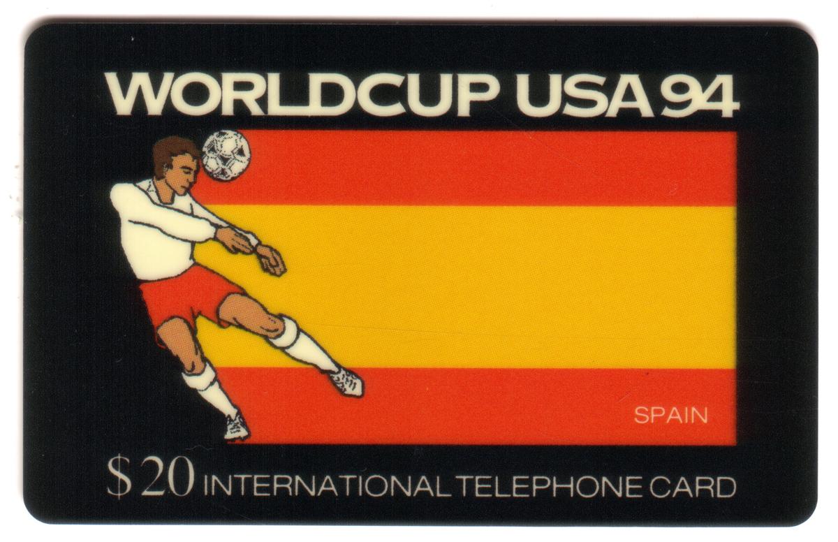 This collectible phone card commemorates the 1994 FIFA World Cup held in the United States. It features the flag of Spain prominently on the left side, rendered with vibrant red and yellow colors and the national coat of arms visible near the center of the flag. To the right of the flag, there is an athlete in a dynamic pose, capturing a moment in soccer with a black and white soccer ball positioned near the player’s feet. The athlete wears a white uniform with dark details including a small number “9” on the shorts.