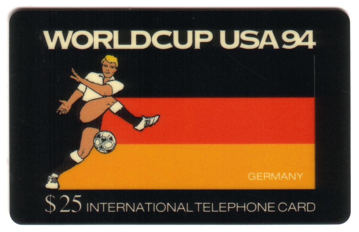 This collectible phone card features imagery related to soccer and international competition, specifically highlighting the 1994 FIFA World Cup held in the United States. The card prominently displays the flag of Germany alongside a German soccer player actively controlling a soccer ball. The athlete is dressed in a uniform consistent with Germany's national team colors and is captured mid-action, emphasizing the theme of international soccer competition.