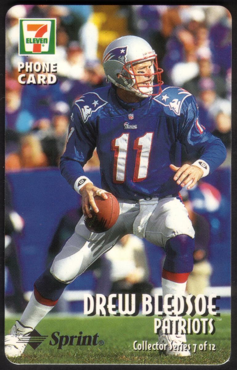 The design prominently displays the number 7, which is Drew Bledsoe’s jersey number with the New England Patriots. The front of the card also mentions the year 1996 and features the Patriots logo, confirming the timeframe and team. The overall graphic style combines photographic and illustrated elements to create an energetic sports collectible phone card focusing on Drew Bledsoe and his NFL career.