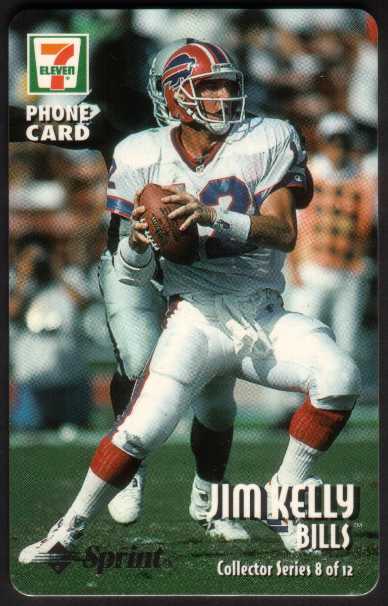The card is associated with the 1996 NFL season and highlights Jim Kelly’s role with the Buffalo Bills. The branding includes the 7-Eleven logo in the upper left corner alongside the “Sprint Play Football” and “Quarterback Club 15m” markings, indicating it was part of a promotional or collectible series tied to these entities. The NFL shield logo appears in the upper right portion of the card, confirming its official league affiliation.
