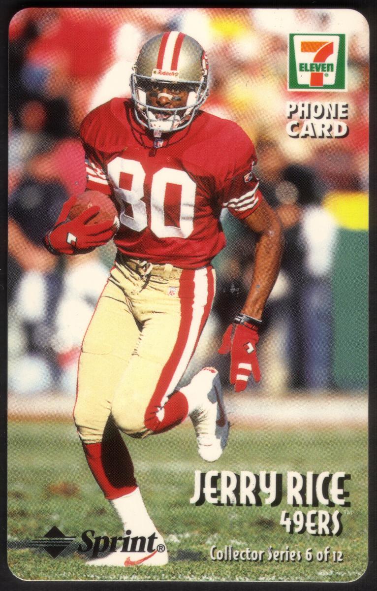 This collectible phone card features Jerry Rice, a legendary NFL wide receiver for the San Francisco 49ers. The card is branded with the 7-Eleven logo, linking it to the convenience store chain. Jerry Rice is shown wearing his 49ers uniform, with the team's red and gold colors clearly visible. The phrase "Sprint Play Football" is printed on the card, associating it with football and sprint promotions.