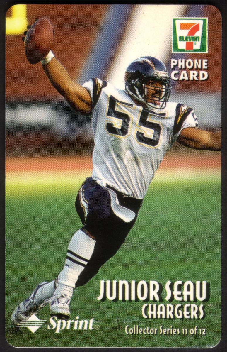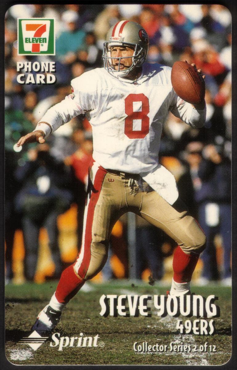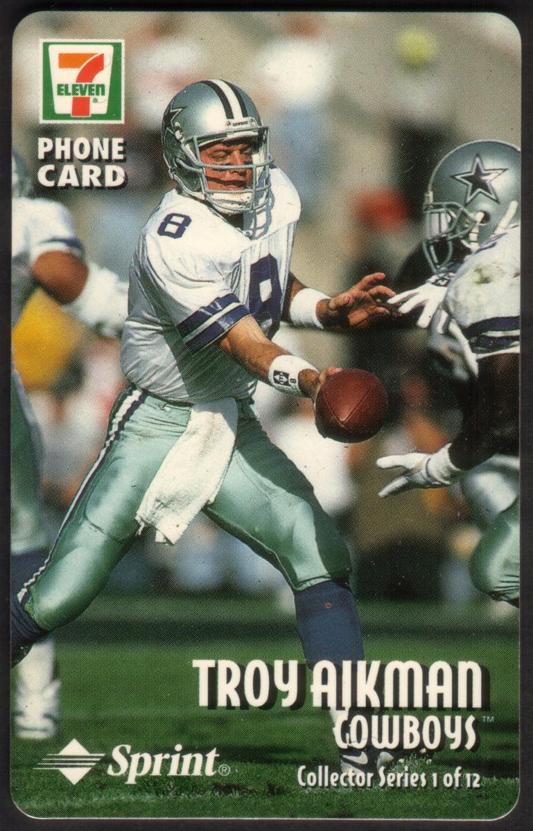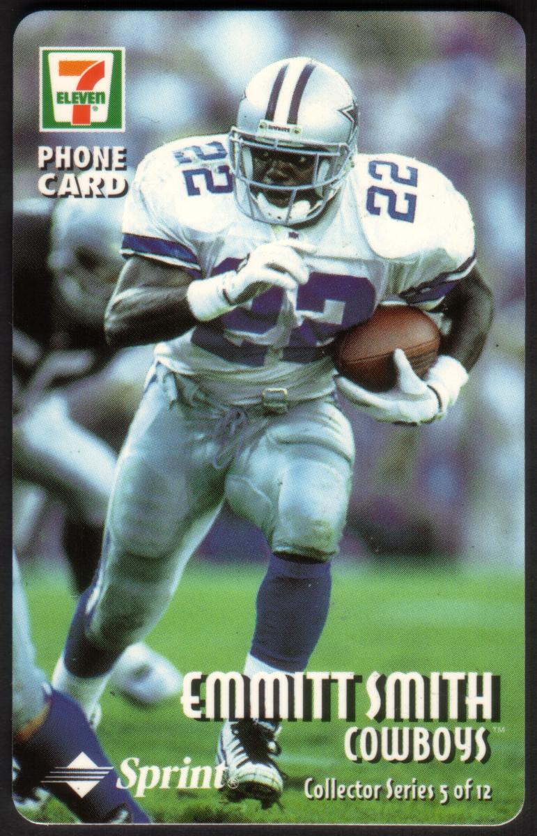 These phone cards provide vivid images of celebrated NFL athletes in full game-day gear, serving as a collectible homage to the 1996 football season. Each image captures the energy and skill of these legendary players representative of their respective teams: Cowboys, Patriots, Broncos, Lions, Bills, Bears, Dolphins, 49ers, Packers, Chargers. This Sprint and 7 Eleven collaboration underlines the intersection of sports memorabilia and phone card collecting, offering prized items for football fans and collectors alike.