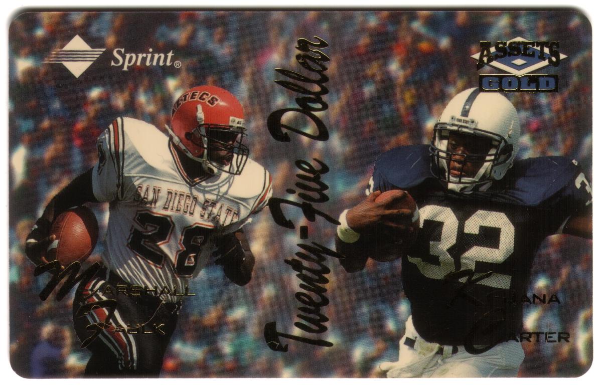 These collectible phone cards from The Score Board Inc. feature a Sports Assets Gold theme with a denomination of twenty-five dollars each. The cards are branded with the Sprint logo and "Assets Gold" in the top right corner, displaying iconic sports figures from football, basketball, and baseball.
