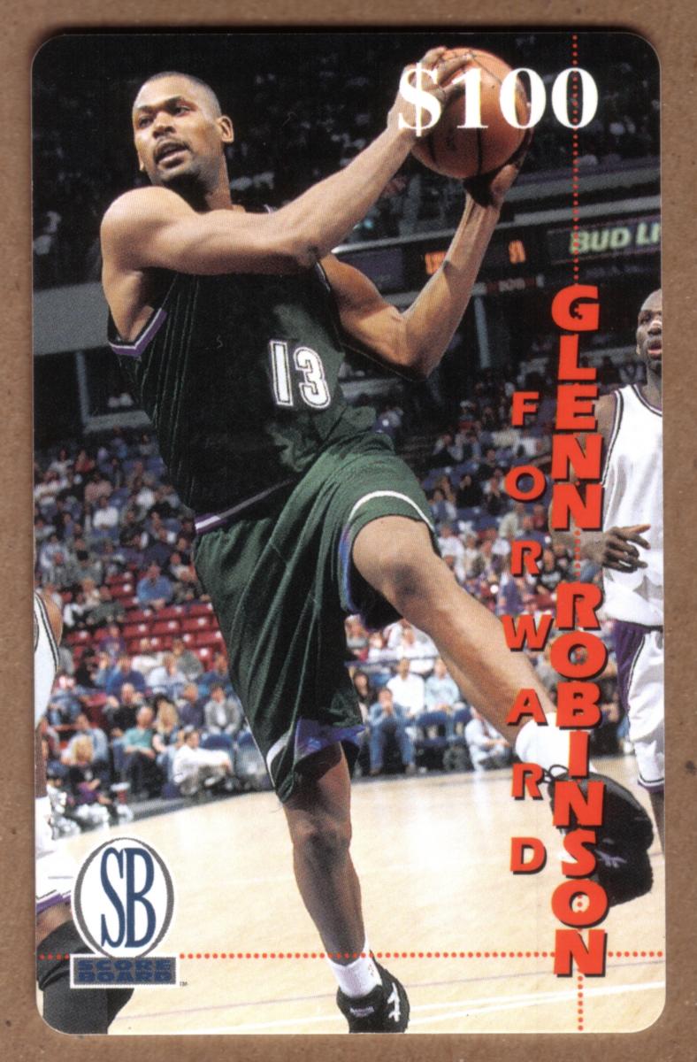 This collectible basketball phone card features Glenn Robinson, a professional basketball forward, captured mid-air while driving towards the basket. Robinson wears a black basketball uniform with the number 13 clearly visible on his jersey. The card includes a bright $100 denomination near the top center. The text on the right side of the card displays "GLENN ROBINSON" in vertical orientation with "FORWARD" written between his first and last name.