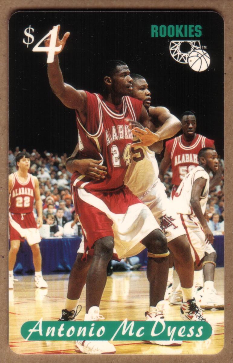 This collectible phone card features an action-packed basketball scene showcasing Antonio McDyess, a collegiate player from the University of Alabama. McDyess is prominently featured wearing a crimson Alabama uniform with the number 24. He is engaged in physical play, backing down an opponent in white during a game, highlighting his strength and presence on the court. The backdrop includes fellow Alabama teammates and opposing team members actively participating in the game, illustrating an intense moment on the basketball court.