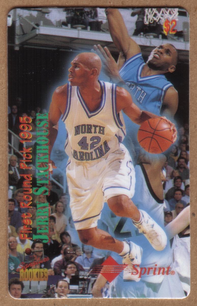 This collectible phone card features Jerry Stackhouse, a basketball player who was a first round pick in 1995. Jerry Stackhouse is shown wearing a white North Carolina jersey with the number 42. The card captures an in-game moment where Stackhouse is driving with the basketball, looking to make a play. Behind him, another player in a blue North Carolina jersey is attempting to defend him.