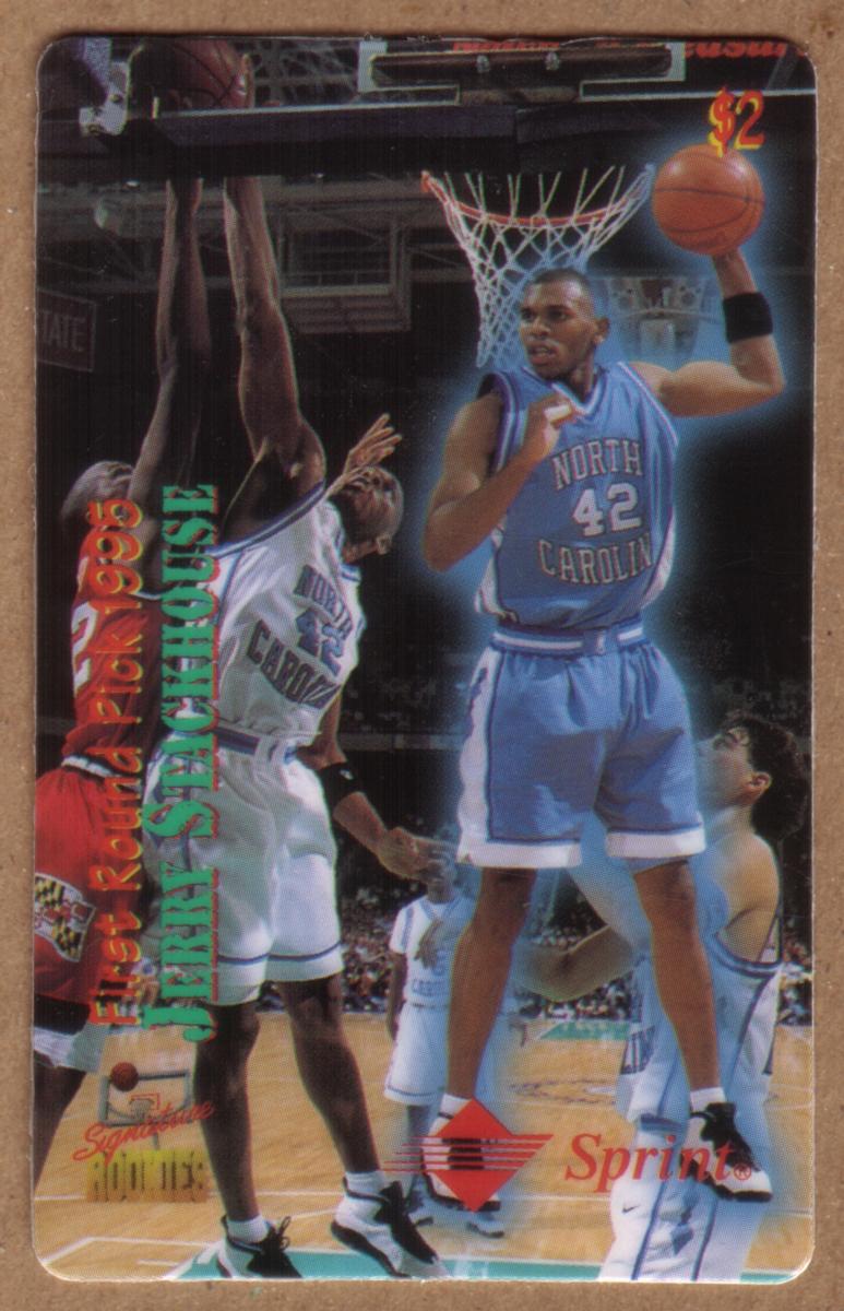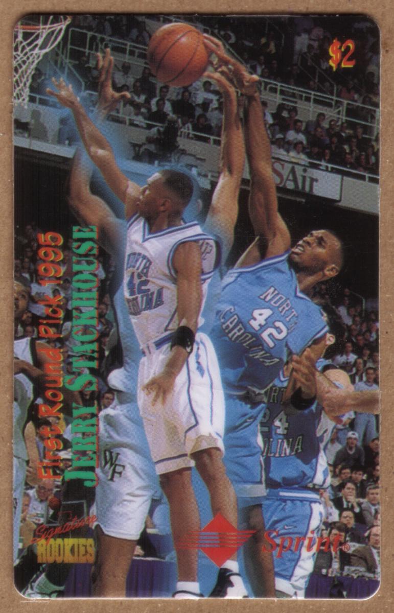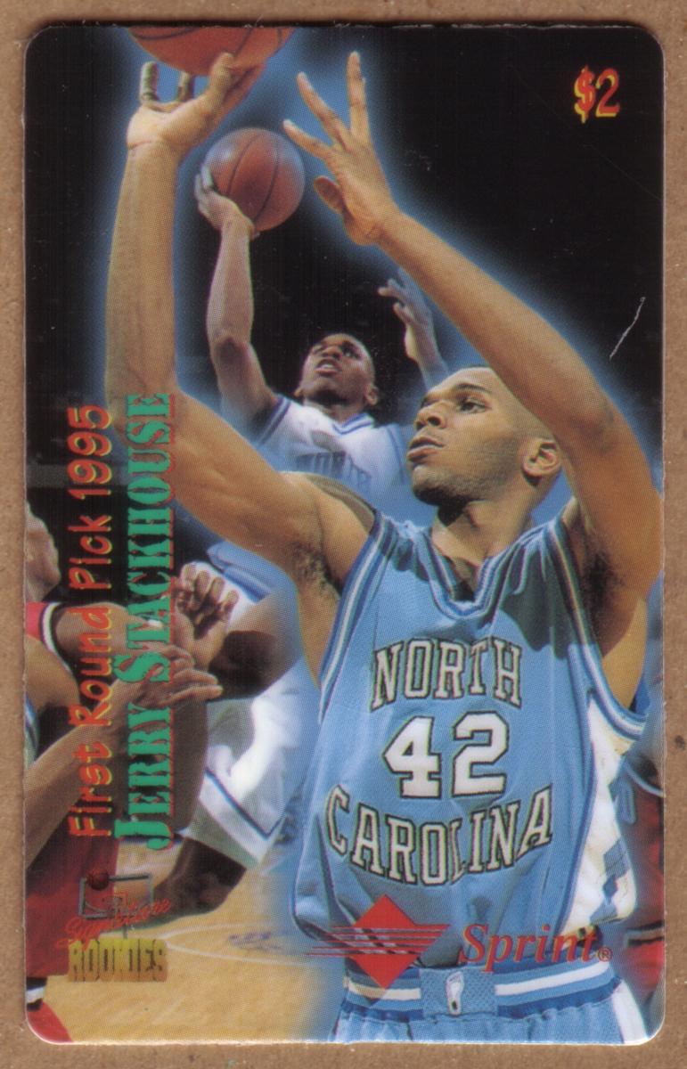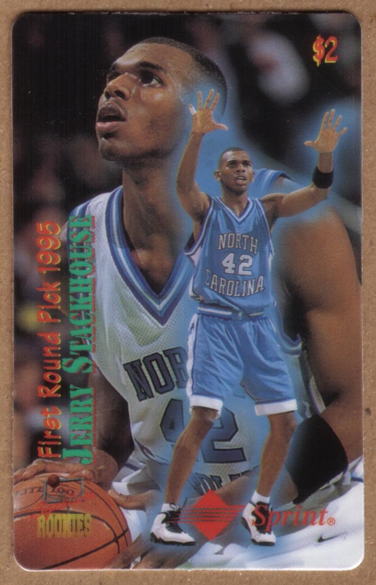 These phone cards celebrate Jerry Stackhouse’s rookie status and connection to North Carolina basketball, making them a notable collectible for sports fans and basketball card collectors. The vibrant photography and consistent design tie the set together, focusing squarely on Stackhouse’s early basketball career moments.