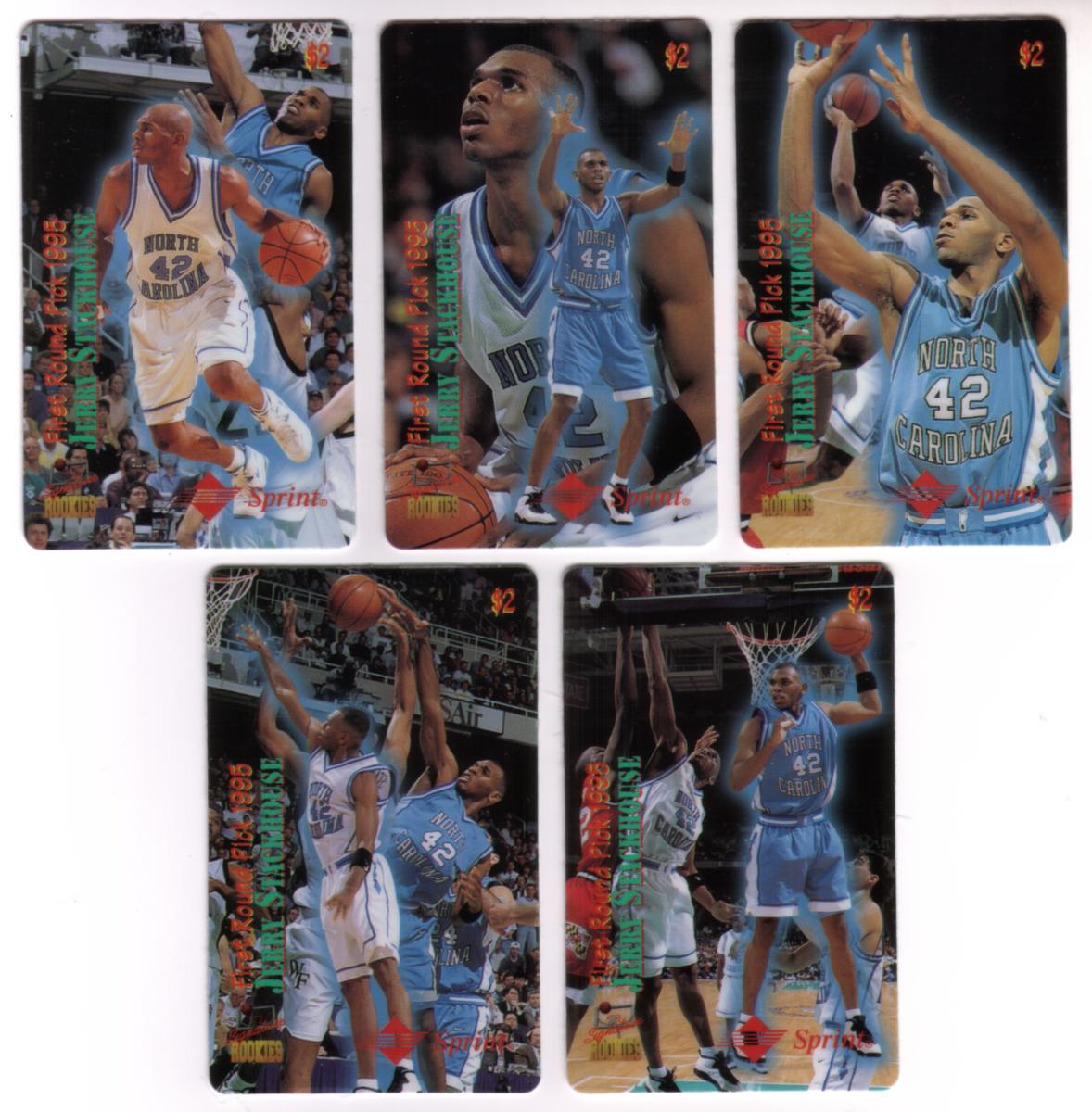 This set consists of five collectible Sprint phone cards featuring Jerry Stackhouse, a basketball player known for being a first round pick in the 1995 NBA draft. Each card displays action shots of Stackhouse wearing a North Carolina basketball uniform with the number 42. The images capture dynamic moments during basketball games, highlighting his skills in mid-air plays, shooting, and defense.