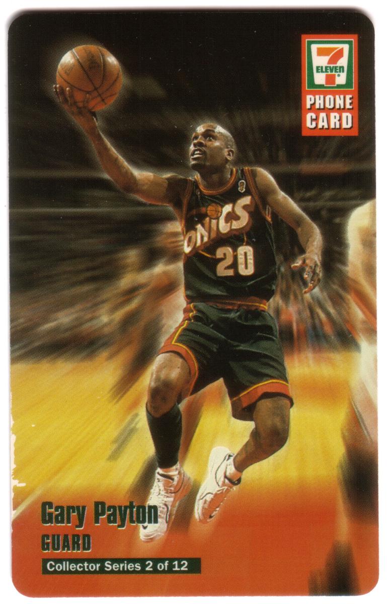 Overall, this card is a collectible basketball chip card centered on Gary Payton’s role as a guard in 1997, enhanced by sponsorship marks from 7-Eleven and AT&T. It is part of a limited run series, as shown by the numbering (#2/12), making it an item of interest for basketball and memorabilia enthusiasts.