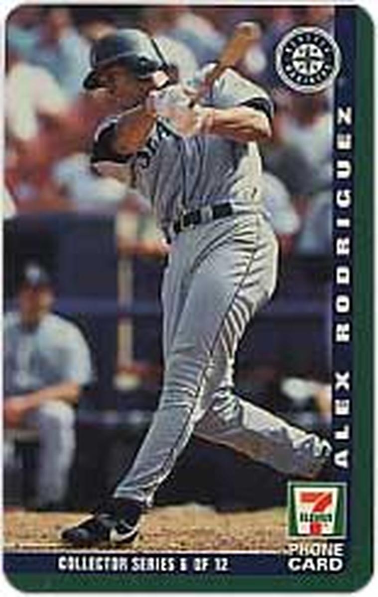 This collectible phone card features Alex Rodriguez, a Major League Baseball player, prominently displayed in his Seattle Mariners uniform. The card captures Rodriguez in a batting stance wearing his number 6 jersey. The background includes a graphic scoreboard design with the word "SCOREBOARD" written across the top in large white letters outlined in green. The card also displays the official Major League Baseball logo positioned near the bottom.