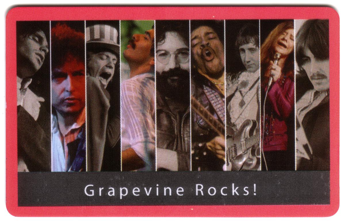 The card includes the text "Grapevine Rocks!" prominently at the bottom in white letters on a black background strip. The card is bordered in red, framing the lineup of legendary rock artists. This collectible highlights renowned musicians associated with famous bands such as The Doors, The Rolling Stones, The Grateful Dead, The Who, and The Beatles.