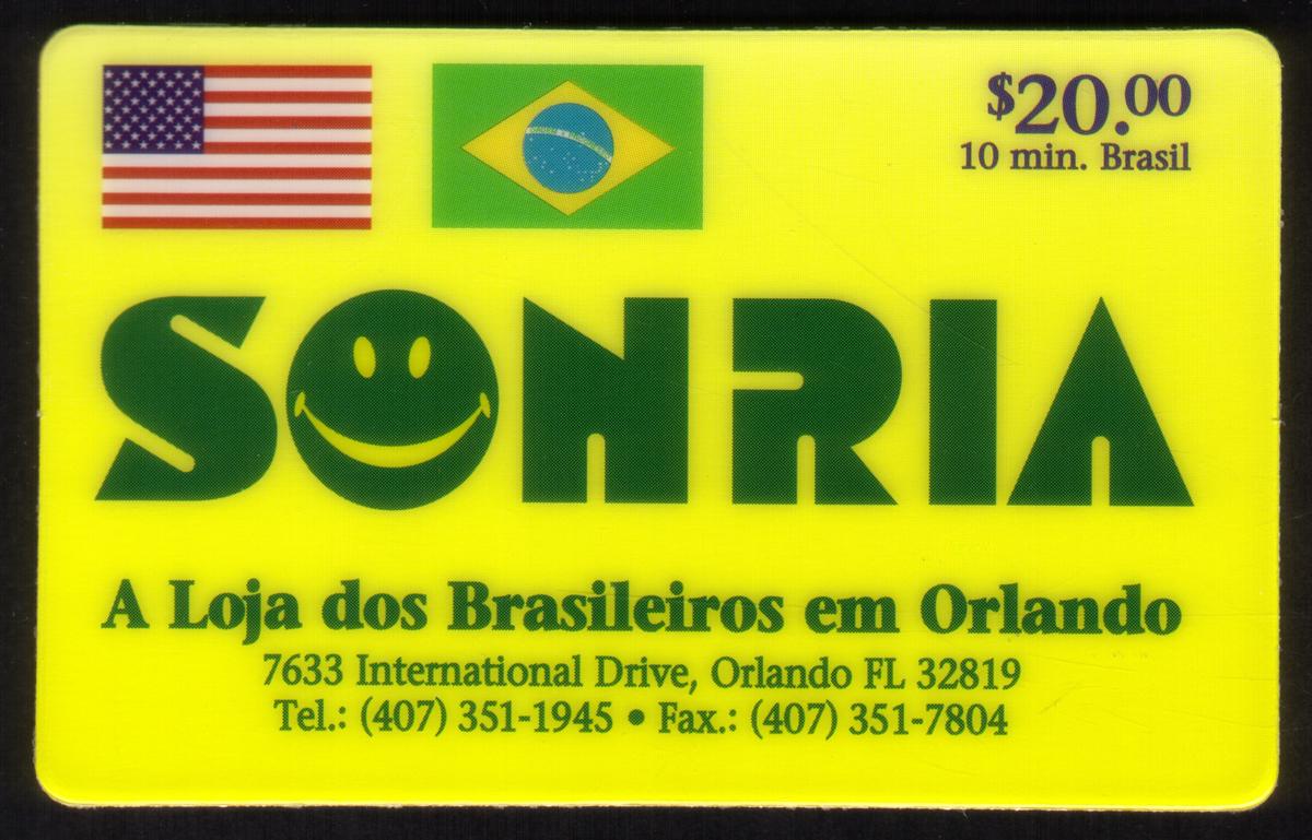 This collectible card features a bright yellow background with two small national flags placed side by side near the upper left corner: the United States flag and the Brazilian flag. Below the flags, the word "Sonria" appears in blue letters, which means "smile" in Portuguese and Spanish.