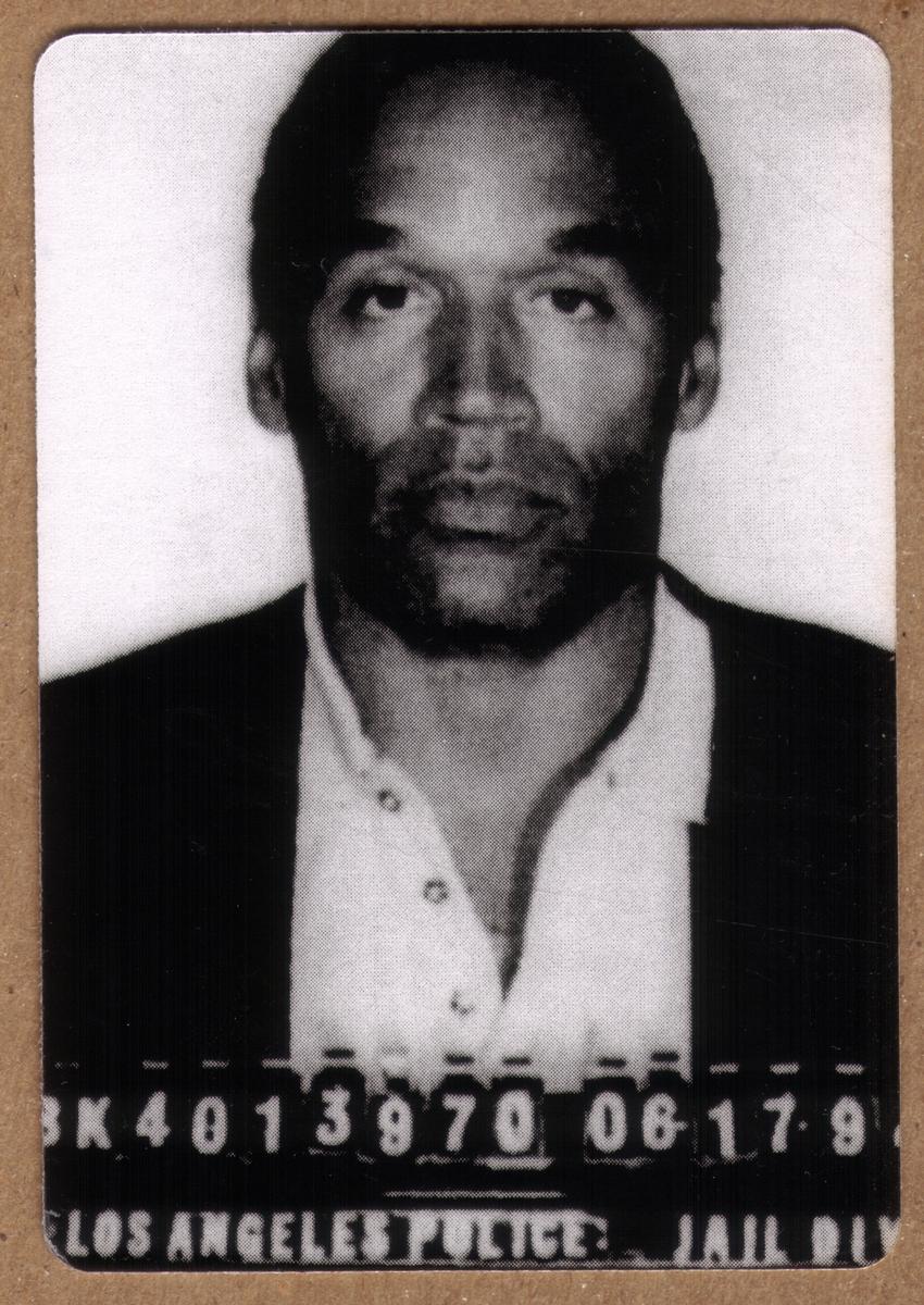 This collectible card features a black and white mugshot photograph of O.J. Simpson, a famous football star and celebrity. The image shows a close-up of Simpson's face, with a neutral expression. He is wearing a collared shirt under a dark jacket.