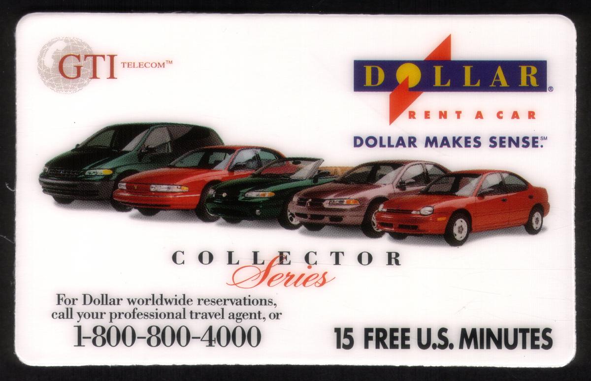 Vintage Dollar Rent-A-Car promotional card featuring five classic vehicles, offering 15 free U.S. minutes and travel booking info. |
