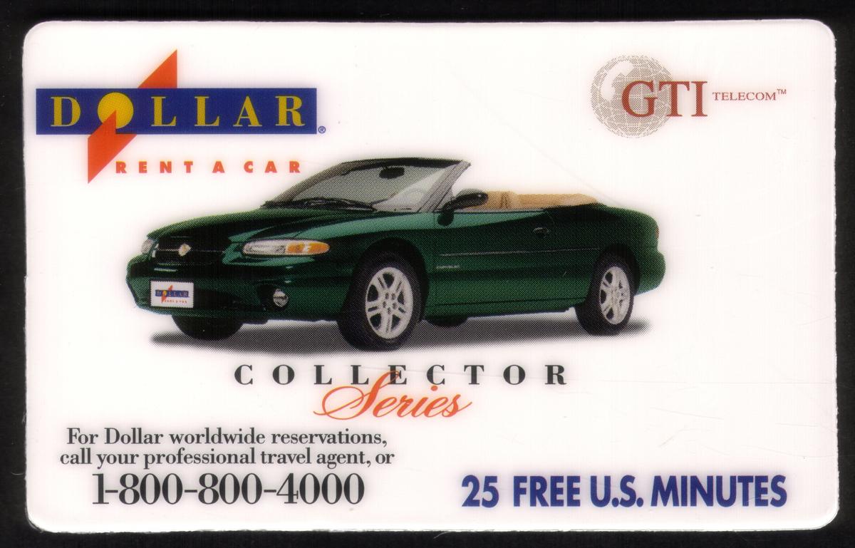 Text on the card includes "25m Dollar Rent-A-Car Series: Green Chrysler Sebring Conv." printed near the top left area. The lower left corner displays the GTI Telecom, Inc. logo, indicating the card issuer or sponsor. The overall design focuses on automotive themes, highlighting travel, transportation, and business-related imagery associated with car rentals.