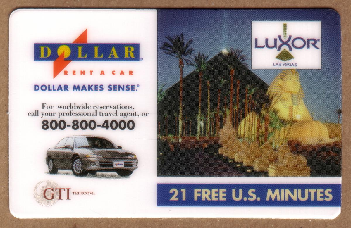 This collectible phone card features promotional branding for Dollar Rent-A-Car and the Luxor Hotel in Las Vegas. The left side of the card prominently displays the Dollar Rent-A-Car logo above the slogan "Dollar Makes Sense." Below that, there is a message for worldwide reservations directing customers to call 800-800-4000, along with a picture of a silver car. The GTI Telecom, Inc. logo is also shown, indicating the telecom company associated with the card.