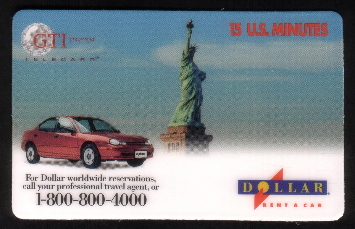 Additional textual elements on the card include the phrase "15m Dollar Rent-A-Car," indicating the card's value or usage allotment. The card also displays logos and trademarks associated with Dollar Rent-A-Car and GTI Telecom, Inc., the telecommunications provider. The combination of automobile imagery and national monuments reflects immigration and sightseeing themes, consistent with the cultural and historical significance of the Statue of Liberty.