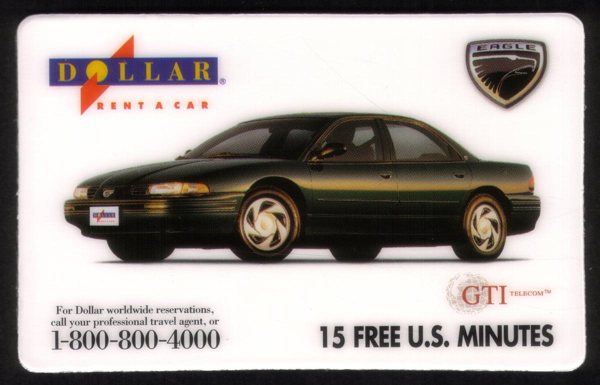 No additional characters or locations are mentioned, keeping the focus entirely on the Chrysler Eagle Vision vehicle and its association with Dollar Rent-A-Car and GTI Telecom, Inc. The card serves as a promotional collectible related to cars, travel, and transportation.