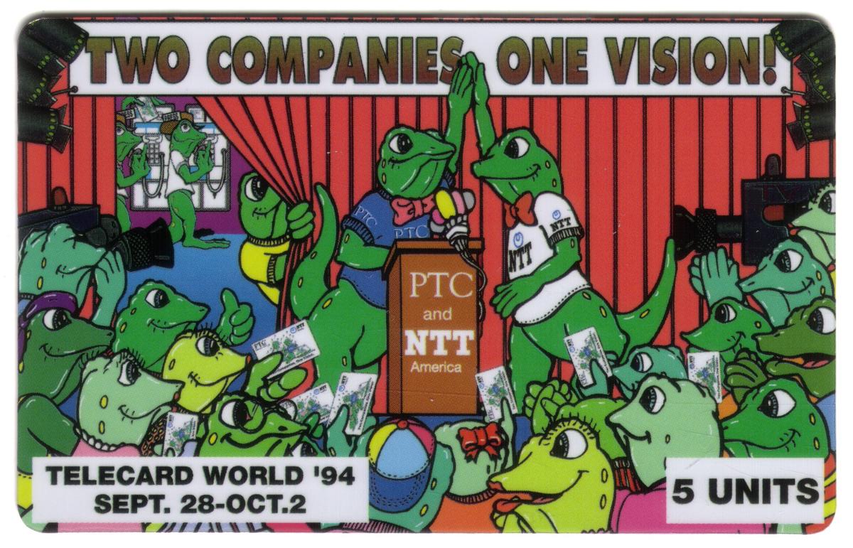 Two company names, “PTC” and “NTT America,” appear on the card, accompanied by the slogan “Two Companies, One Vision.” This slogan is printed in block letters, reinforcing the collaboration between PTC and NTT America. The card also includes the number “5u,” indicating its unit value for telephone usage.