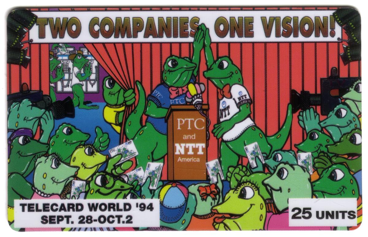 Overall, this collectible phone card is a commemorative piece for telecom and media-related events, combining cartoon art with corporate branding. It captures the spirit of the 1994 telecommunication shows and expos by featuring reptiles as a thematic focus in a fun, artistic presentation.
