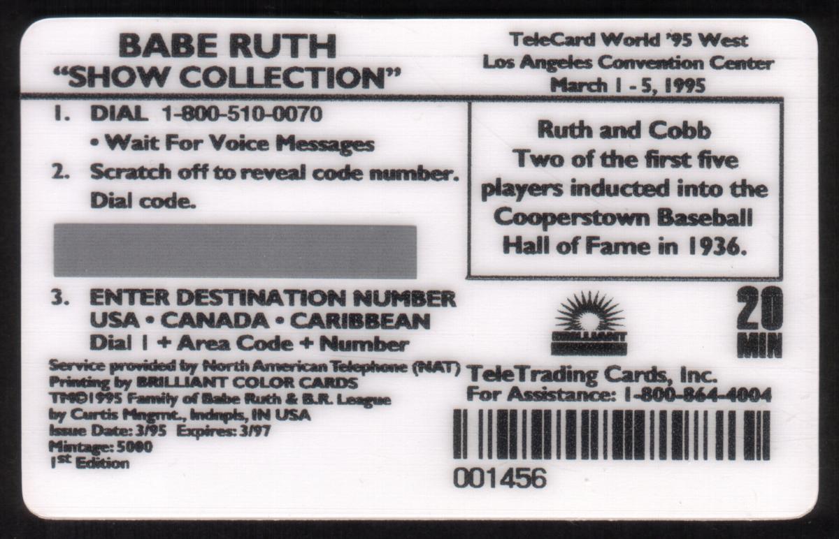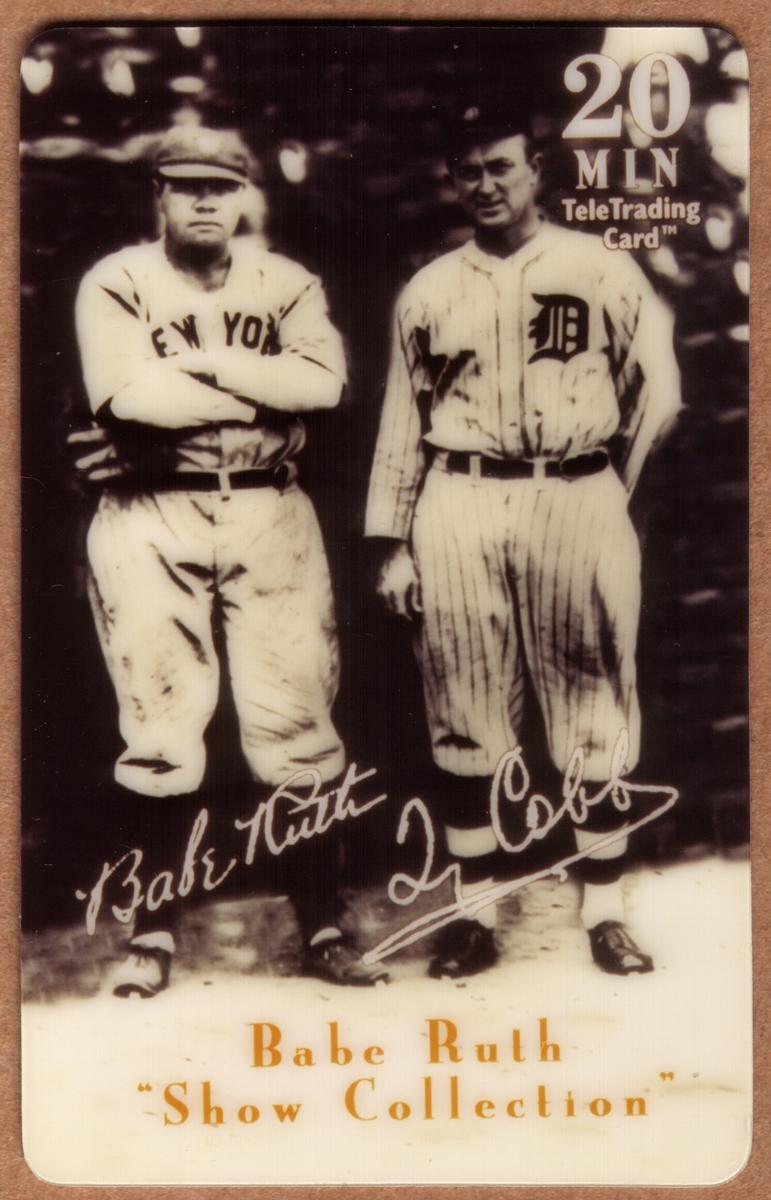 The card prominently displays "20 MIN" in the upper right corner, indicating its value for telecommunications. The names "Babe Ruth" and "Ty Cobb" are scripted in white handwriting near their respective images. Below the photograph, the text reads "Babe Ruth 'Show Collection,'" indicating the theme of the collectible card.