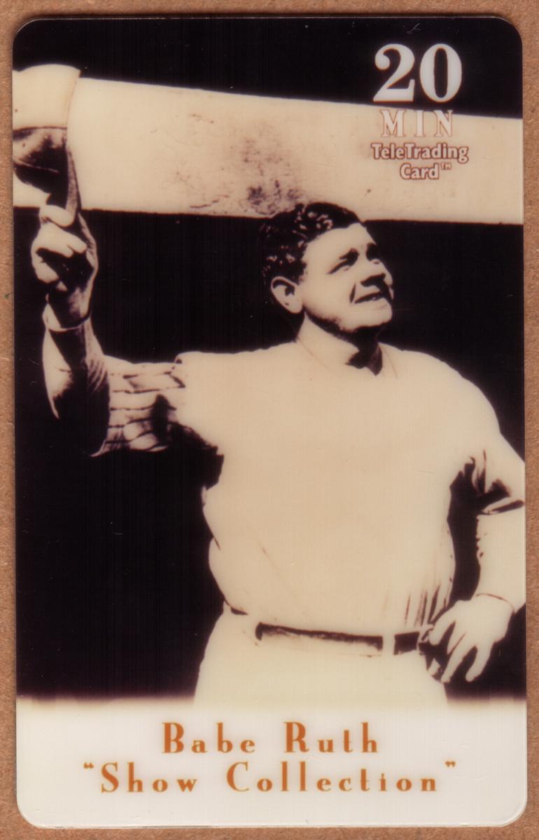 The card includes text at the bottom identifying the image as part of a "Show Collection," specifically referencing Babe Ruth. In the top right corner, the card indicates a value of "20 Min" and the label "TeleTrading Card™," displaying its function as a telecard. The overall design reflects a vintage style that honors Babe Ruth’s status as one of the most iconic sports celebrities in baseball history.
