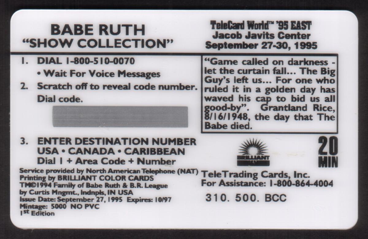 Vintage Babe Ruth phone card with 20-minute calling value, featuring a sepia-toned action shot, nostalgic design, and collectible appeal. |