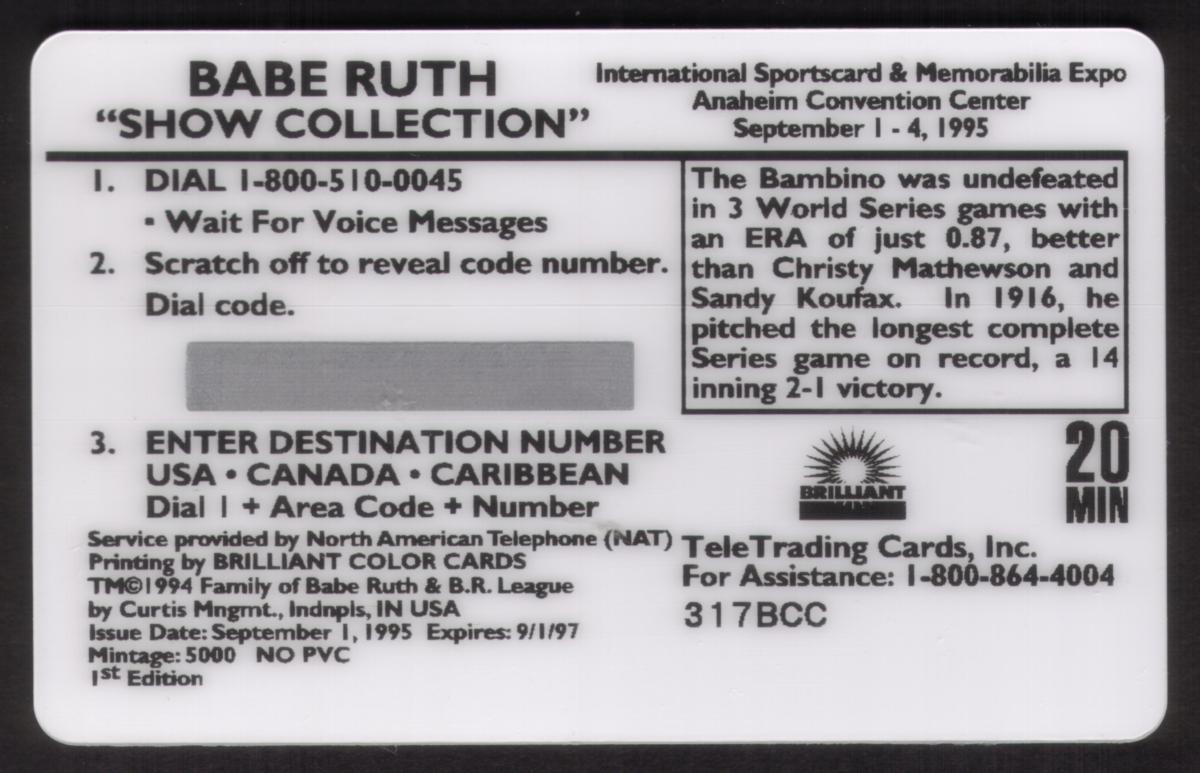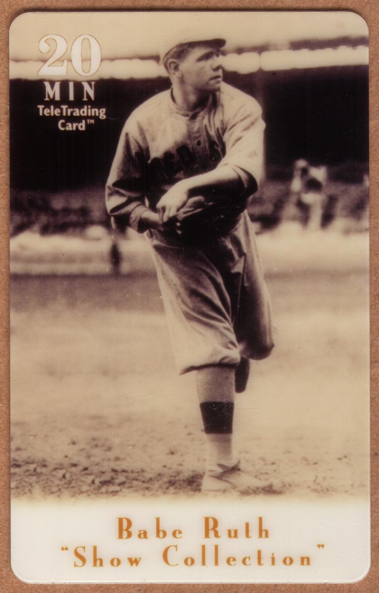 The card is identified as a "20 MIN TeleTrading Card™," indicating it is a collectible telephone card offering 20 minutes of call time. Text at the bottom reads "Babe Ruth 'Show Collection'," linking it to a specialized series celebrating Babe Ruth's baseball career. The card is produced by TeleTrading Cards Inc., a company known for collectible phone cards featuring sports legends.