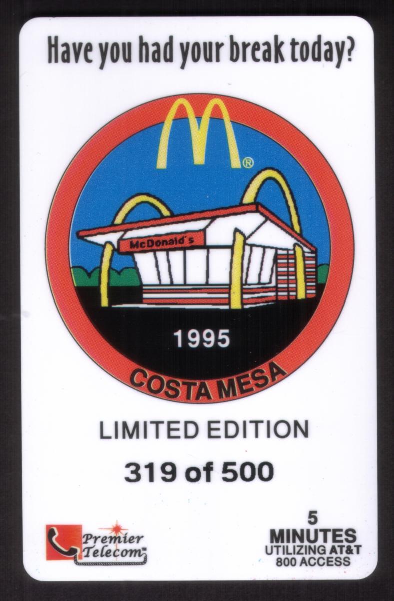 This phone card serves as a collectible piece representing McDonald's, the globally recognized fast food chain famous for its Golden Arches emblem and association with numerous charities including the Ronald McDonald House. It highlights the 1995 Costa Mesa McDonald's location and reflects promotional efforts tied to McDonald's brand and fundraising activities.