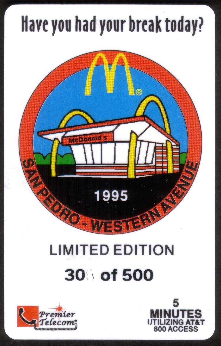 Small text on the card includes "5m McDonald's Restaurant - 1995 San Pedro - Western Avenue - Premier Telecom," identifying a specific McDonald's restaurant location and the phone card’s value as 5 minutes. This information confirms the card as a collectible phone card issued for promotional or fundraising purposes, likely associated with Premier Telecom. The inclusion of these details ties the card to McDonald's restaurants and charitable activities.