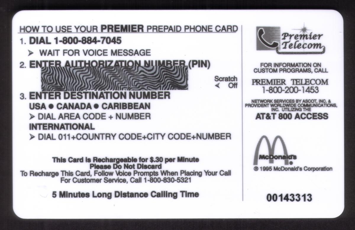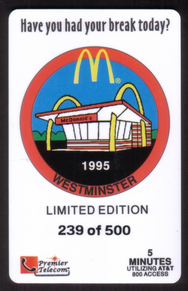 This card relates to McDonald's, the fast food chain known for its Golden Arches logo, and is connected with Premier Telecom and AT&T services. It likely commemorates or promotes the McDonald's restaurant in Westminster from 1995, combining corporate branding with telecommunications.