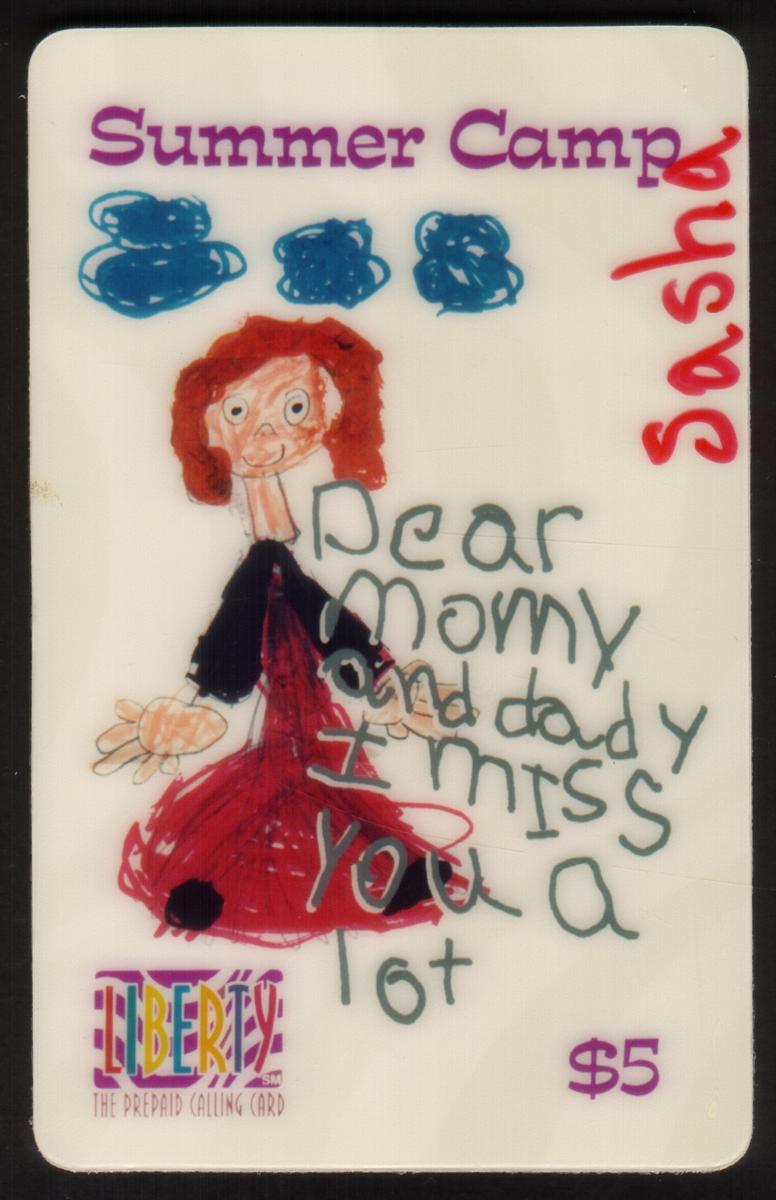 The card has a face value of $5, clearly printed in the top left corner, indicating its monetary denomination. The inclusion of a personal note and signature by Sasha makes this card unique among collectible phone cards. The combination of art, signature, and the summer camp theme connects personally with the concept of staying in touch while away from family.