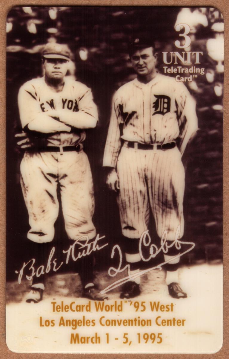 The card highlights themes of baseball legends and sports celebrities, featuring two of the most influential players from early 20th-century baseball. It is a collectible item issued by TeleTrading Cards Inc., connected to the Los Angeles Expo, emphasizing the historical and cultural importance of Babe Ruth and Ty Cobb in the sports world.
