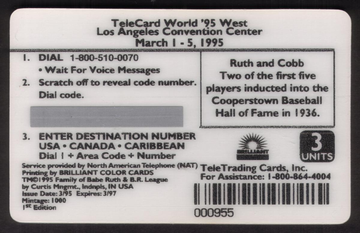 The card is marked as a "3 UNIT TeleTrading Card" in the upper right corner. Below the image, text in gold lettering states: "TeleCard World '95 West Los Angeles Convention Center March 1 - 5, 1995," identifying the event and location associated with this collectible. The card represents a piece commemorating two iconic sports legends known for their significant impact on baseball history.