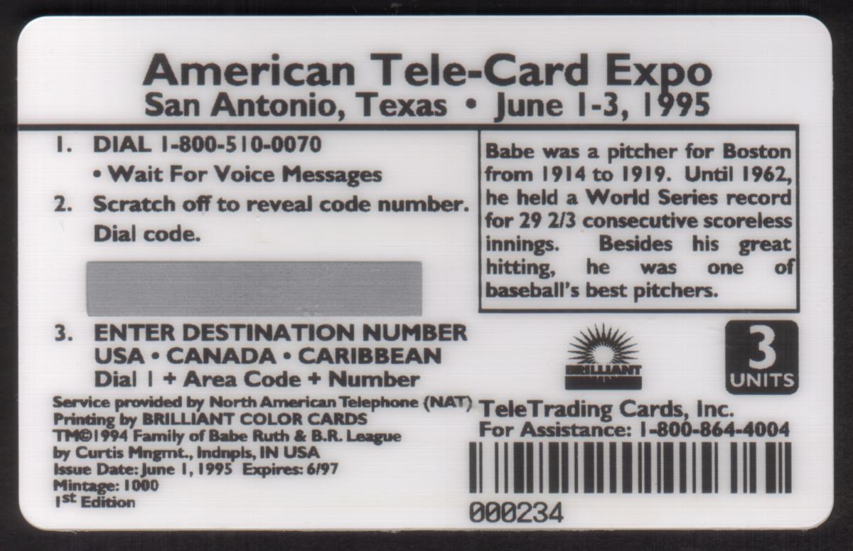 Babe Ruth in Yankees uniform with signature, celebrating baseball history; branded as a 3-minute prepaid phone card from the 1995 American Tele-Card Expo. |