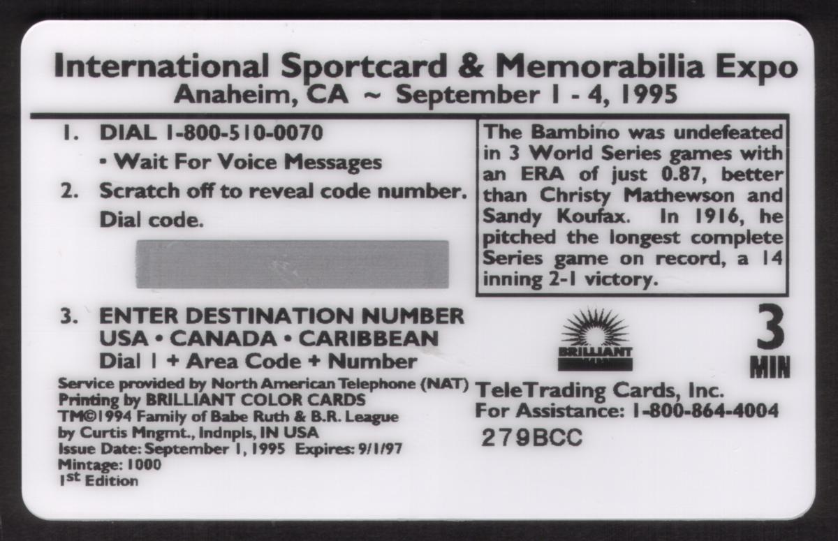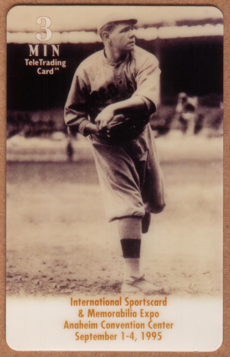 The card is marked with "3 MIN" and "TeleTrading Card" in the upper left corner, indicating its value and type. At the bottom, the text reads "International Sportscard & Memorabilia Expo Anaheim Convention Center September 1-4, 1995," providing the specific event and location related to the card. This denotes that the card is associated with the Anaheim Expo honoring sports legends such as Babe Ruth.
